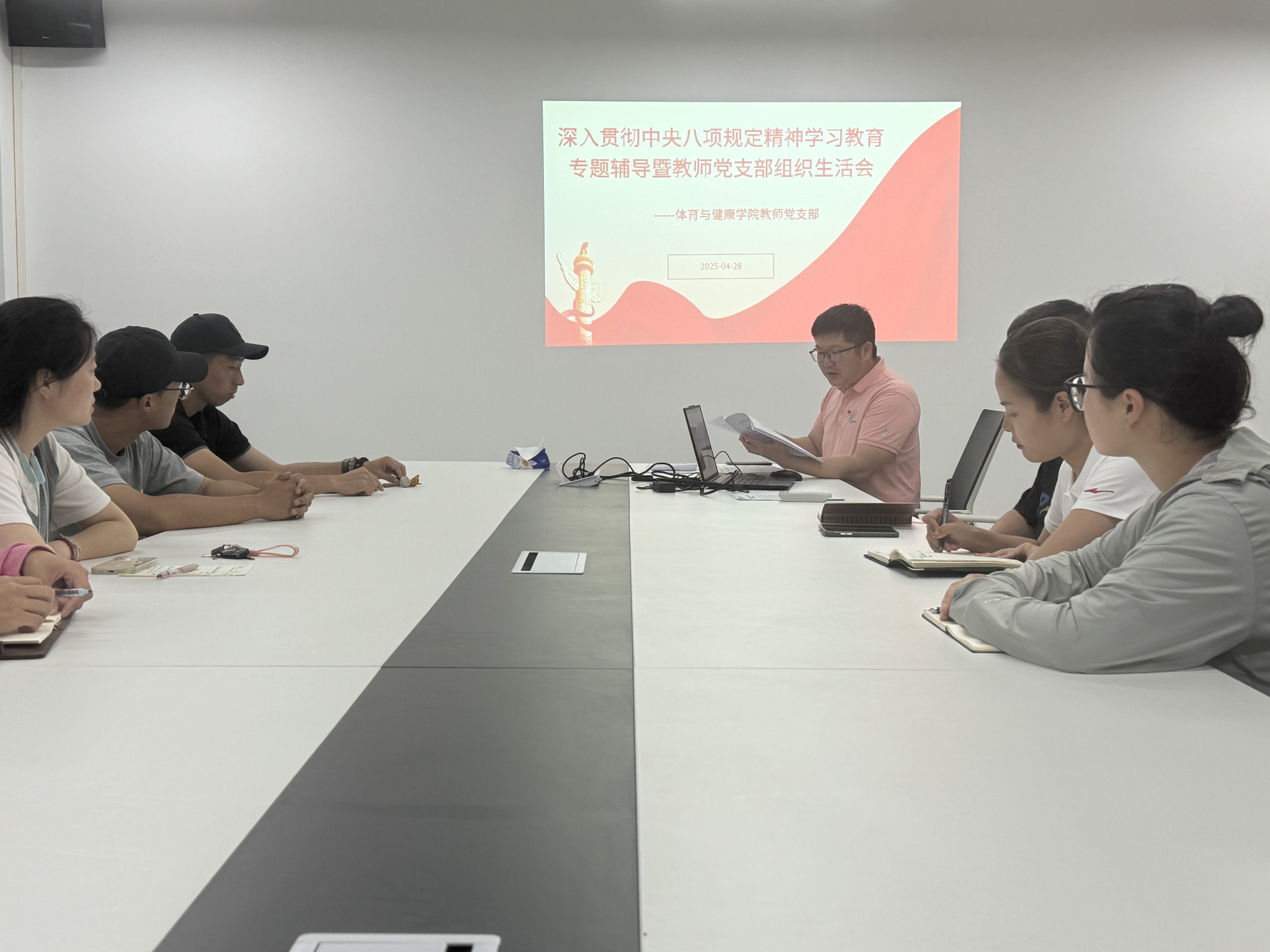 为持续深化作风建设,推动全面从严治党向基层延伸,4 月 28 日,9728太阳集团教师党支部在清远校区 10 号楼 501 会议室召开 “深入贯彻中央八项规定精神问题查摆座谈会暨组织生活会”。会议由支部书记郝世煜主持,全体教师党员参会,围绕中央八项规定精神落实情况,聚焦问题查摆、批评与自我批评,扎实推进作风建设走深走实。