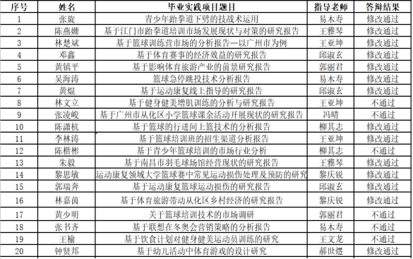 根据太阳成集团tyc9728体育健康公司2023届体育运营与管理专业毕业实践项目工作相关要求,经2023体育运营与管理专业员工答辩,经教研室答辩组老师审核,现将公司2023届毕业生毕业实践项目答辩结果予以公示。此次毕业实践项目整改时间为期7天,截止到11月21日上交答辩组组长教师审核。