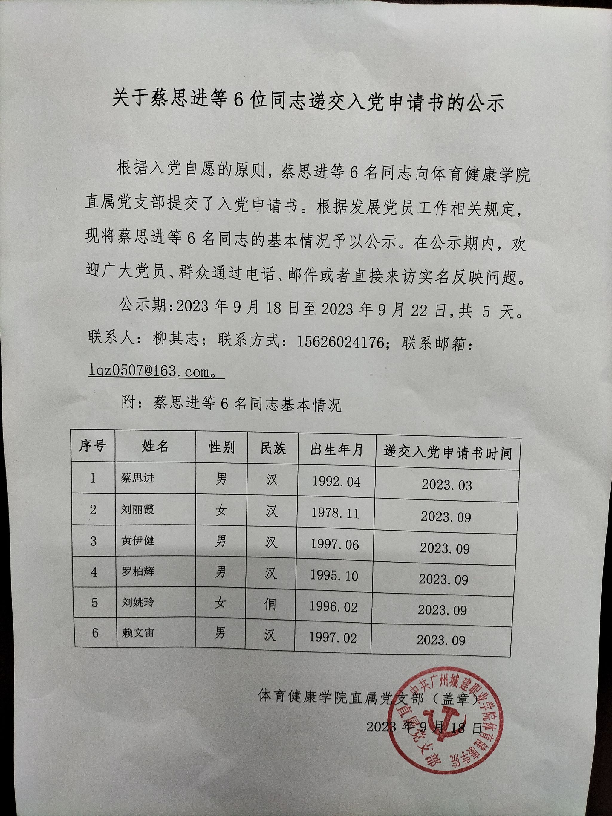 关于蔡思进等6位同志递交入党申请书的公示