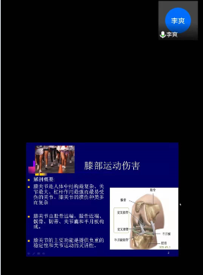 为进一步普及运动损伤防护知识,如何正确的处理膝关节损伤等相关问题,体育健康公司邀请广州大学运动生理学教授、医学博士李爽开展了以“膝关节运动损伤的防护”为主题的讲座。会议采取网络直播的形式,体健院师生参加会议。